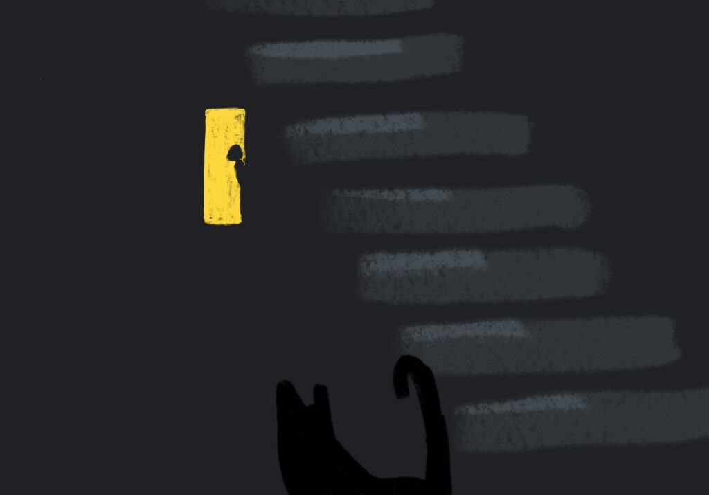 Because of you, I stand under the trees waiting A short, sharp meow. You rush over in greeting, tail high. My fingers slip through your soft gray fur Dull gray fur, lit by that Flashlight of white on your neck and stomach.